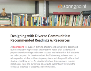 We encourage folks to peruse these tools and readings, and continue exploring how their school design team might leverage thoughtful, equity-based frameworks and mindsets throughout their efforts. And please let us know if there are any additional resources that we should consider adding. We are always looking to update and enrich our resources further: info@springpointschools.org