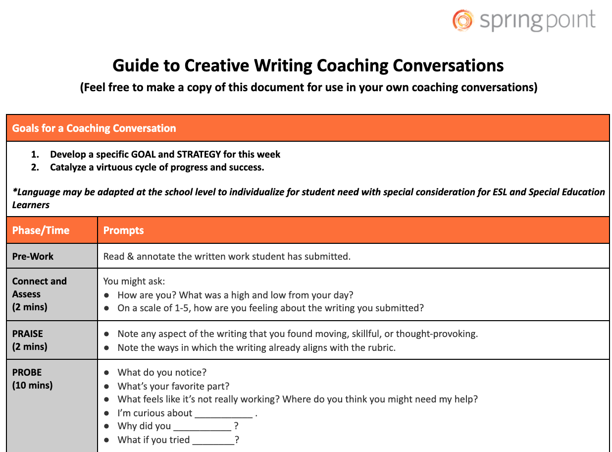 One of the suite of tools Springpoint developed to support writing coaches as they work with students.